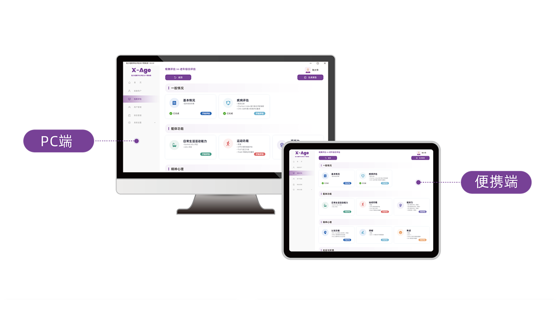 現(xiàn)代老年人不僅關(guān)注生理健康,更注重心理認(rèn)知、社交能力及生活自理等多個方面的能力表現(xiàn)。X-Age老年綜合評估系統(tǒng)通過標(biāo)準(zhǔn)化評估量表,收集各項指標(biāo)數(shù)據(jù),涵蓋生理、心理、認(rèn)知和社會功能等多維度內(nèi)容。篩查老年人群的潛在健康風(fēng)險,快速輸出綜合評估報告?;谠u估結(jié)果,醫(yī)師可制定個性化干預(yù)方案和綜合照護(hù)計劃,從而實現(xiàn)老年人健康的全程化管理,提升老年人的生活質(zhì)量與健康水平。